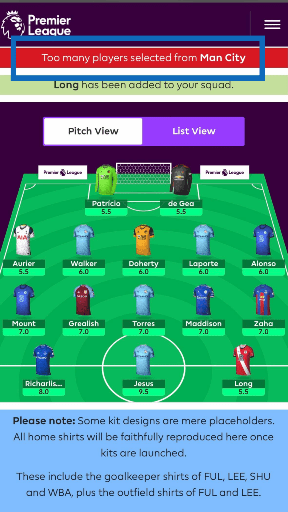 သတ်မှတ်ငွေ ၁၀၀ ထက်ပိုမို ရွေးချယ်ထားမယ် (သို့) Premier League တသင်းထဲကမှ ကစားသမား သုံးဦးထက် ပိုမို ရွေးထားမယ် ဆိုပါက Enter Squad ကို နှိပ်လို့ ရမည်မဟုတ်ပါ။ အားလုံးမှန်မှန်ကန်ကန် ရွေးချယ်ပြီးပါက Enter Squad ကို နှိပ်လိုက်ပါ ။ အသင်းအတွက် ကစားသမား ရွေးချယ်မှု အောင်အောင်မြင်မြင် ပြီးသွားပြီ ဖြစ်ပါတယ်။