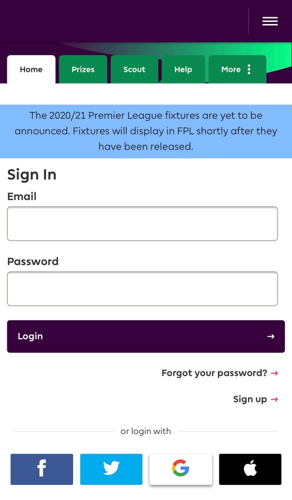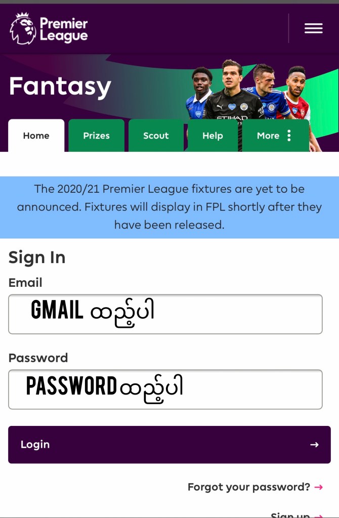 Fantasy Premier League ကို Sign Up လုပ်ပြီးလို့ Login ဝင်လိုက်ပြီ ဆိုတာနဲ့ ပေးထားတဲ့ ငွေ ၁၀၀ နဲ့ ကစားသမား ၁၅ ယောက်ဝယ်ယူရမှာ ဖြစ်ပါတယ်။ Sign Up မလုပ်ရသေးပါက အောက်ပါ Link များမှ ကြည့်ပြီး လုပ်နိုင်ပါတယ်။