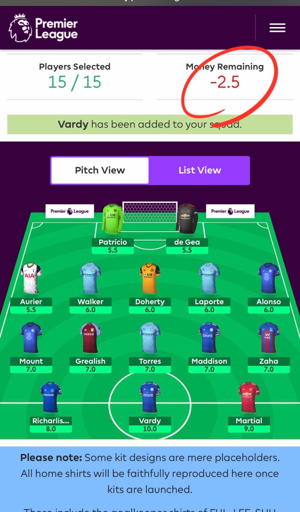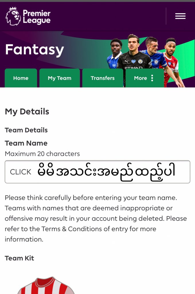 ရွေးချယ်ပြီးတဲ့ ကစားသမားတွေကို England Premier League မစတင်ခင် ၂ နာရီအထိ လဲလှယ်ခွင့် ရှိပါတယ် ။ အကယ်၍ Premier League ကစနှင့်နေပြီး နောက်ကျမှ Account ဖွင့်ခဲ့တယ် ဆိုရင်တော့ နောက်တပွဲမစခင် ၂ နာရီအထိ လူလဲလို့ ရပါတယ်။အောက်မှာ ဆက်လက်ပြီး Design your kit မှနေ၍ အသင်းဝတ်စုံကို ကလိလိုရပါသေးတယ်ခင်ဗျ။ နောက် Post တွေမှာ Fantasy premier league ရဲ့ တခြား သိရမဲ့ အရာလေးတွေ တင်ပေးမှမို့ မကြာခဏ လာရောက်ဖို့ ဖိတ်ခေါ်ပါတယ် ။