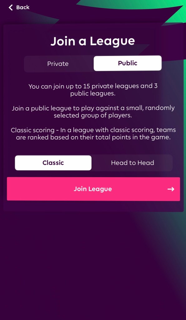 Join classic league သို့ Join Head to Head ကြိုက်နှစ် သက်ရာရွေးပါ။ သတိထားရမှာက နှစ်ခုပေါင်း ၅ ခုပဲ ကစားလို့ရမှာကိုပဲ ဖြစ်ပါတယ်။