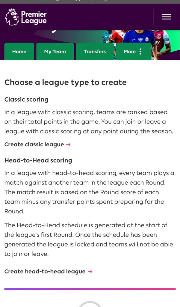 မိမိကစားလိုတဲ့ ကစားနည်းကိုရွေးပါ ။ Create classic league သို့ Create head-to-head league